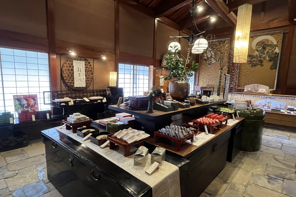 藍色ののれんがゆらめく長屋門の先には、茶室とホールを併設する菓子売場があります。求肥をつぶ餡でくるんだ代表銘菓「あも」をはじめ、定番から季節限定の商品までバラエティ豊かに揃います。