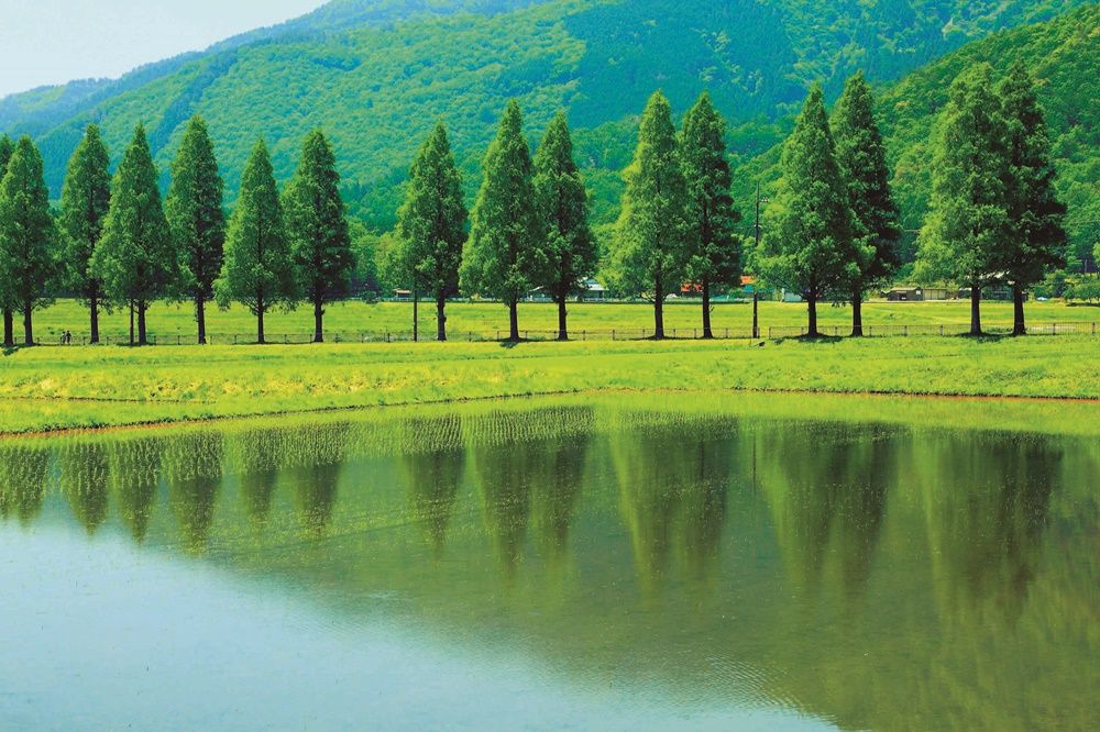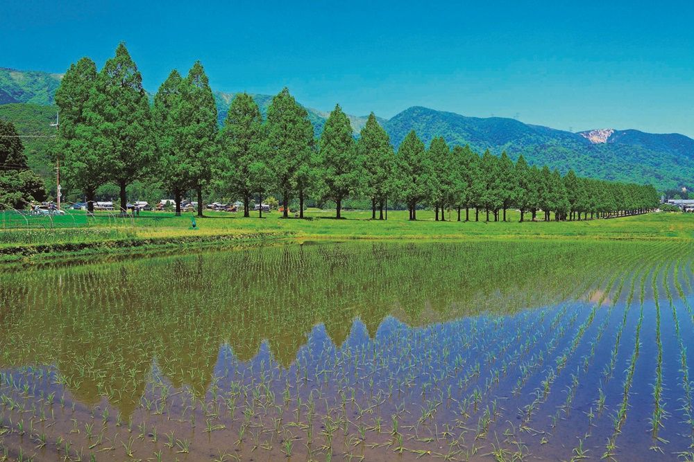 並木に寄り添う散策路を歩くほか、ちょっと離れたところから眺める並木も見逃せません。とくに初夏の風のないおだやかな晴天日、早苗がのぞく水田に水鏡のように映るさまは、とても幻想的。