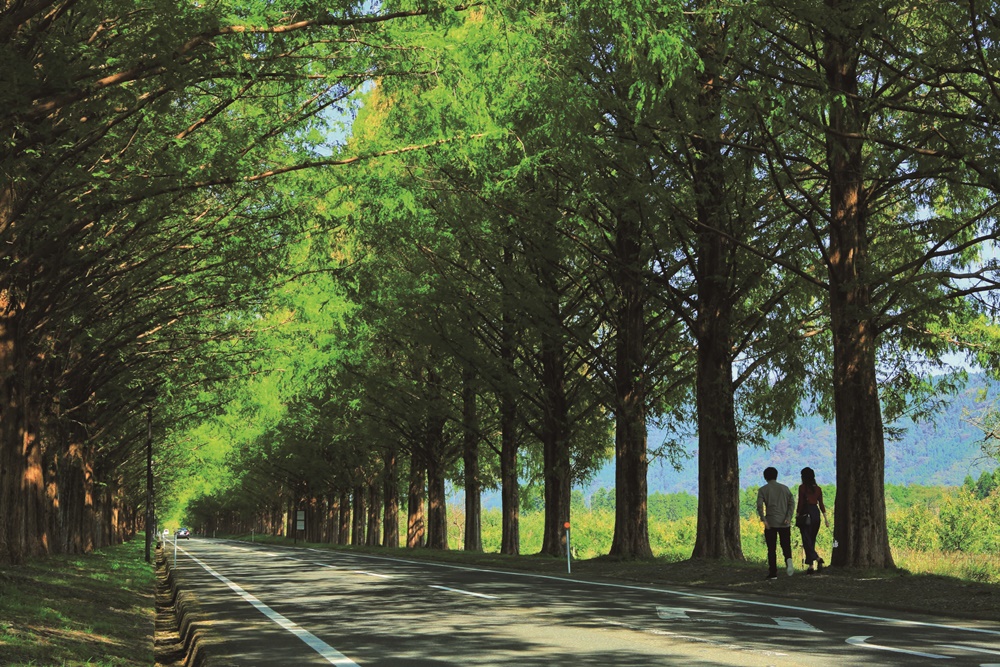 澄みわたる空気のなか、美しい景色と出合える「メタセコイア並木」。季節を変えて何度も訪れたくなる名所です。人や車の往来が少ないのは午前中の早めの時間帯。なるべく早起きしてでかけてみてくださいね。