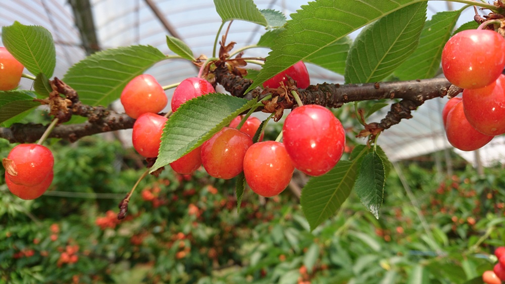 毎年5月下旬から6月中旬頃までのサクランボに始まり、ブルーベリー、ブドウ、栗、さつまいも、10月上旬から11月下旬頃のリンゴまで、季節の果物狩りが楽しめ、さつまいもと栗以外はその場で食べ放題(時間制)もOK。気候によって開園期間や営業時間が変わるため、果物狩りを希望する場合は事前連絡が必要です。