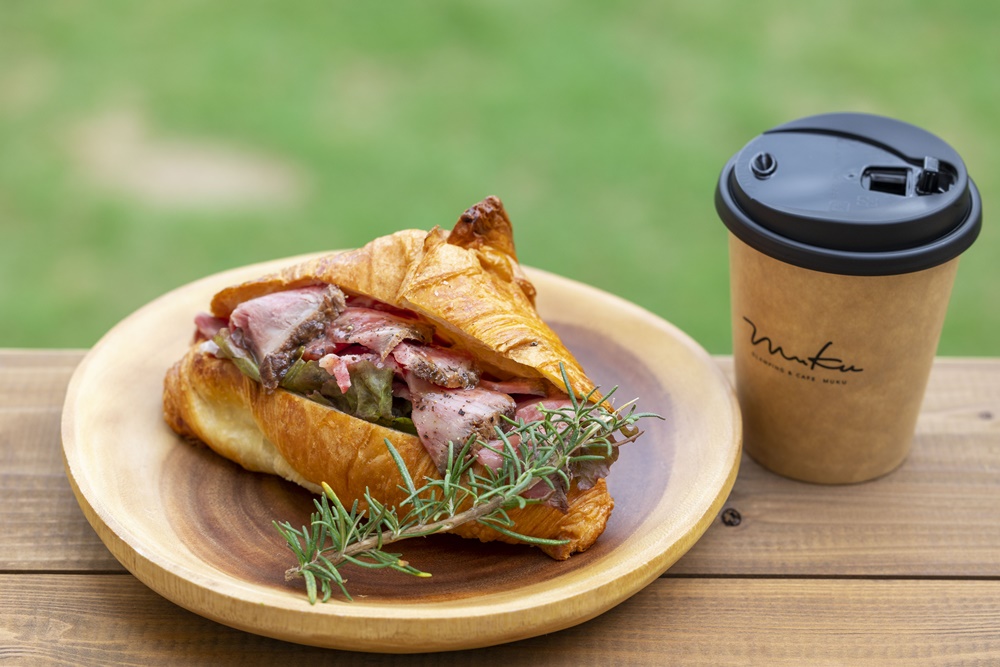 マキノピックランドの南側、メタセコイア並木のそばには2022年にオープンした「GLAMPING&CAFE MUKU」も。宿泊できるグランピング施設ですが、クロワッサンサンドが自慢のカフェは宿泊客以外も利用できます。テラス席はペットの同伴もOK。