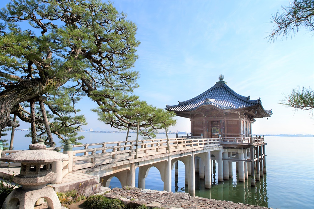湖上に立つお堂の内部に1000体もの阿弥陀仏を祀るお寺です。平安時代後期、湖上の安全と衆生済度を願って創建されました。お堂のまわりをぐるりと一周することができるので、橋を渡って靴を脱ぎ、お堂の反対側にまわってみて。琵琶湖大橋や対岸の景色が一望できます。