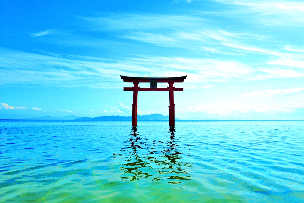 1200年以上前に創建されたと伝わる近江最古級の神社。鳥居が湖上に立つことから「近江の厳島」とも。御祭神は導きや道開きの神様・猿田彦命で、長寿、縁結び、子授けなどあらゆるご利益で親しまれています。近年新設された展望台「藍湖(おうみ)白鬚台」から眺めるのがおすすめです。