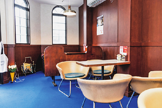 青い絨毯にレトロな家具の店内は、ノスタルジックな印象です。
