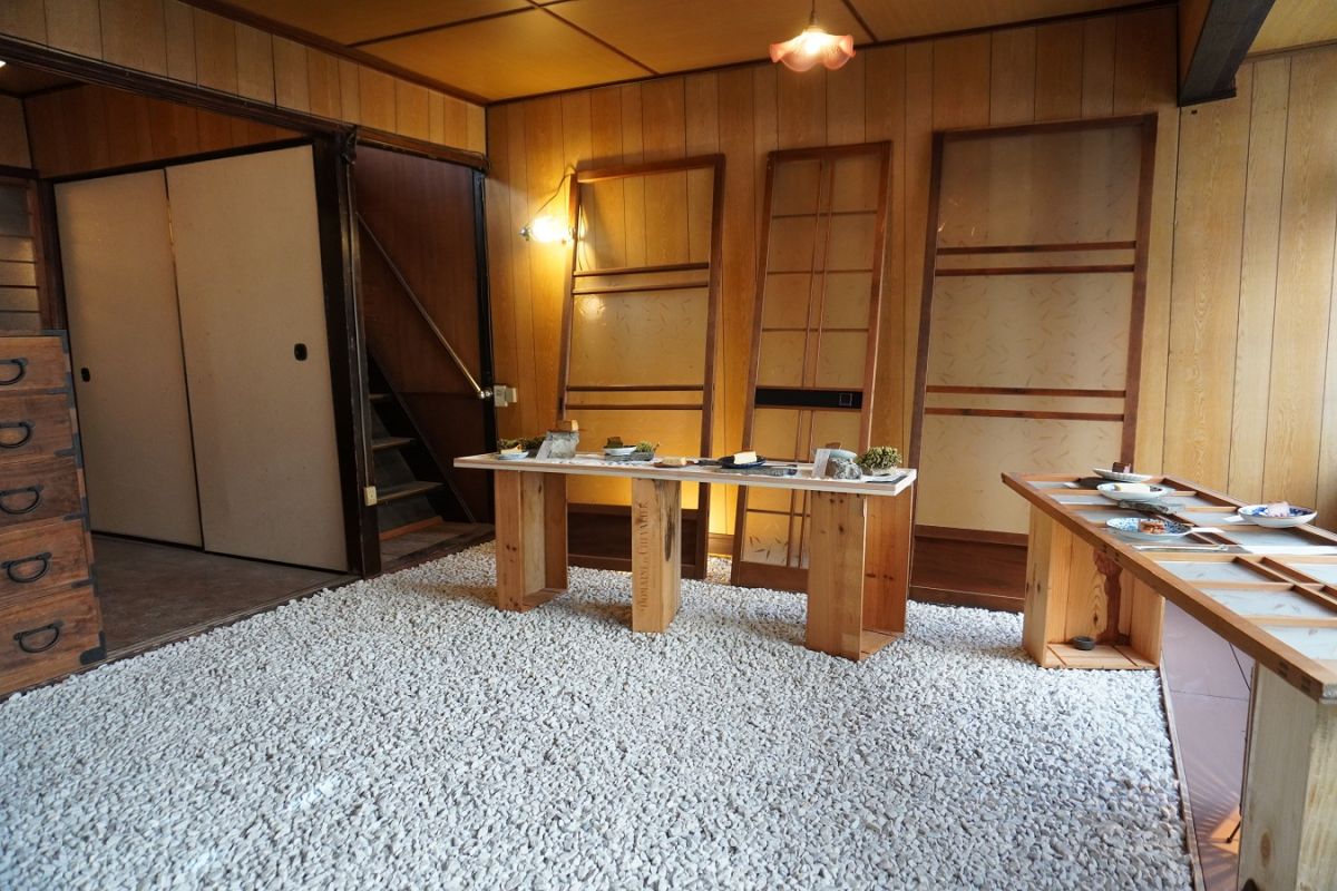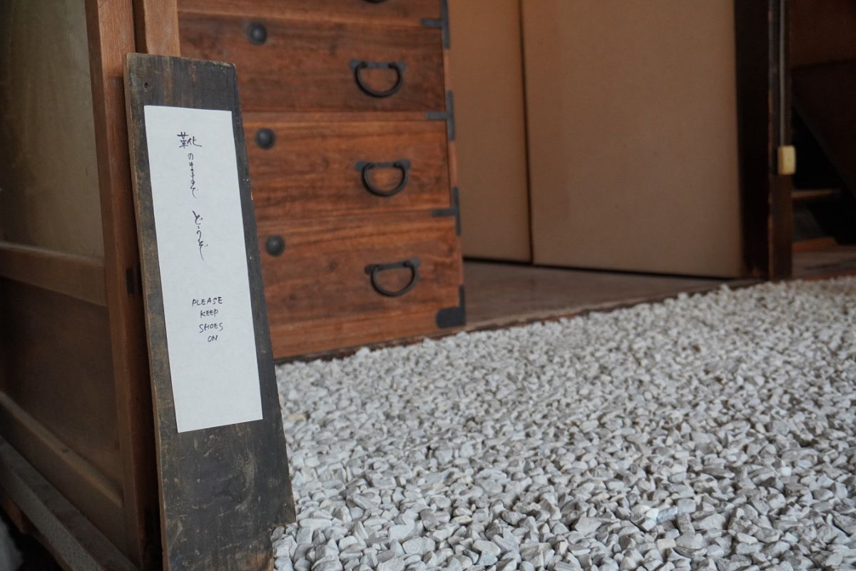 のれんをくぐって店内に入ると、なんと和室だったスペースに砂利が敷き詰められ、石庭のような空間が広がっています。