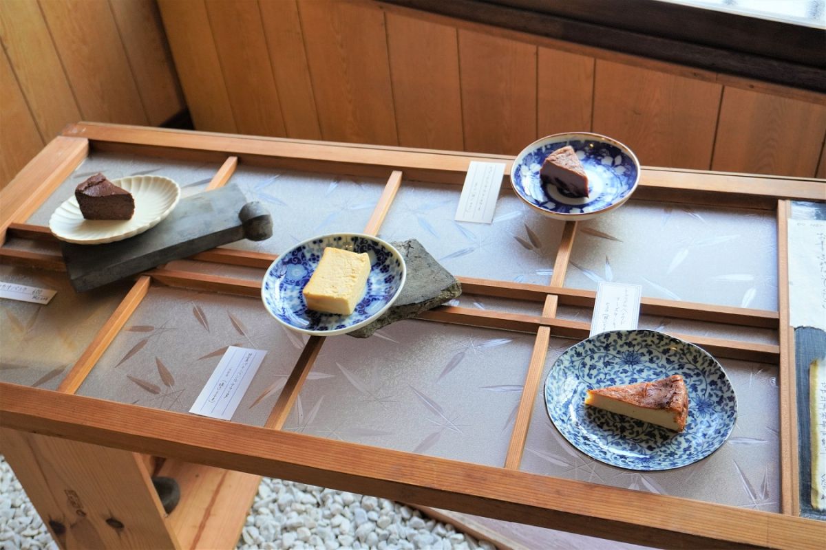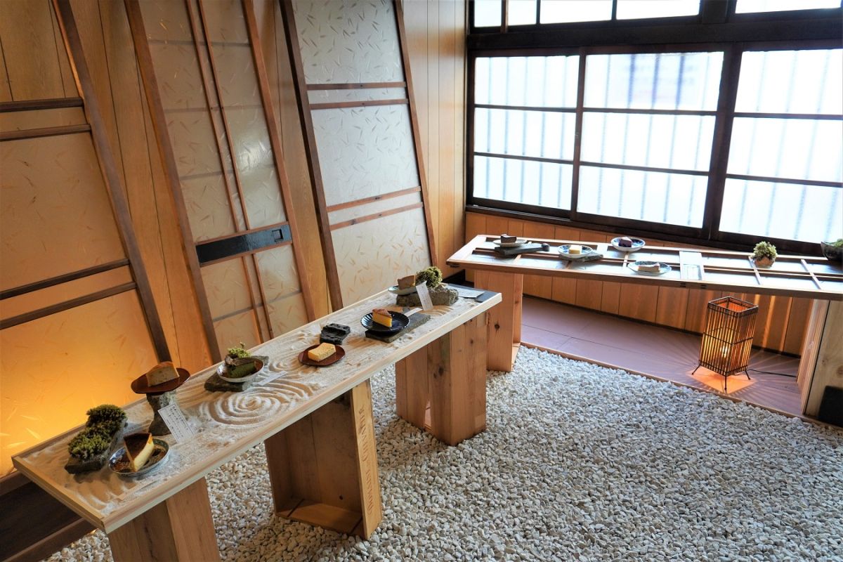 チーズケーキが並んでいるのは、枯山水の日本庭園をイメージした木の台やレトロなガラス障子の上。選ぶ楽しみを味わってほしいと、京都らしいサプライズ的な演出です。