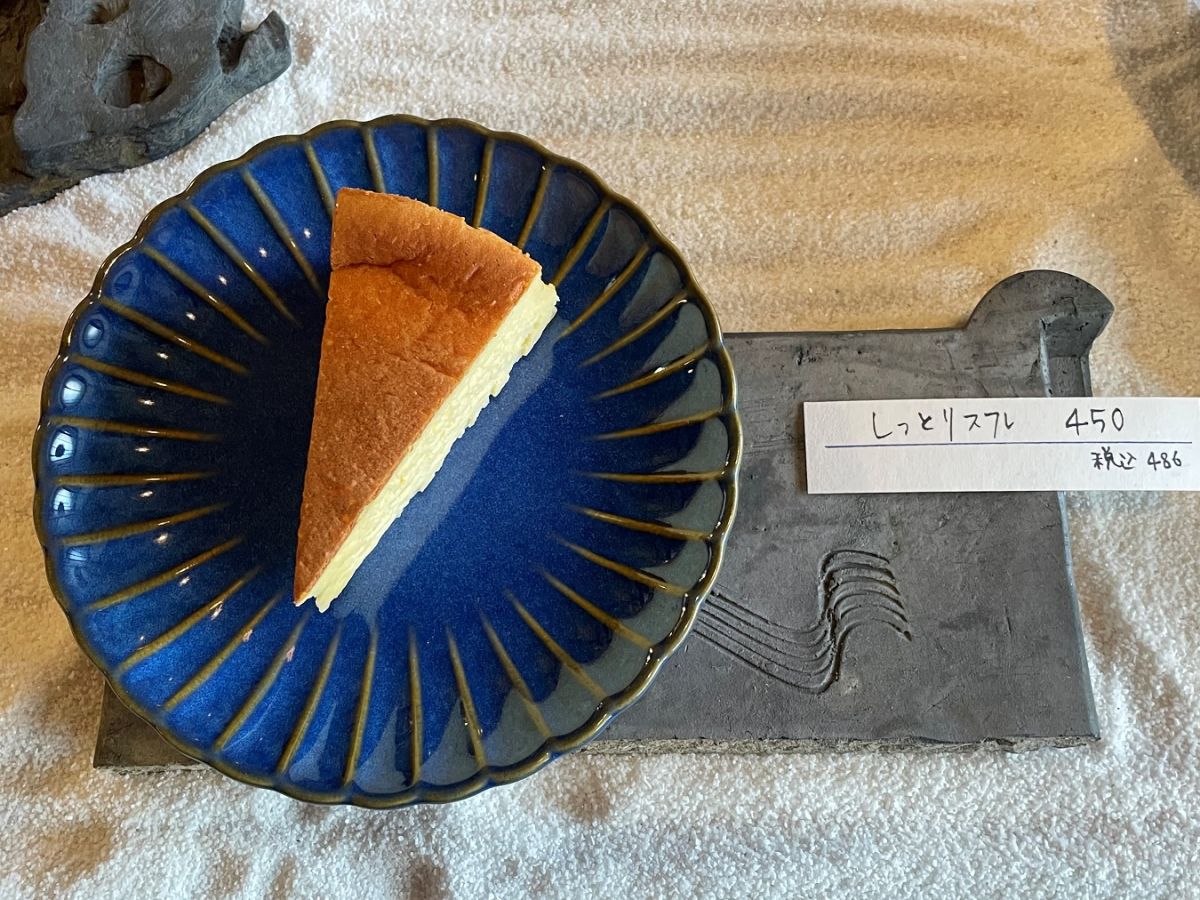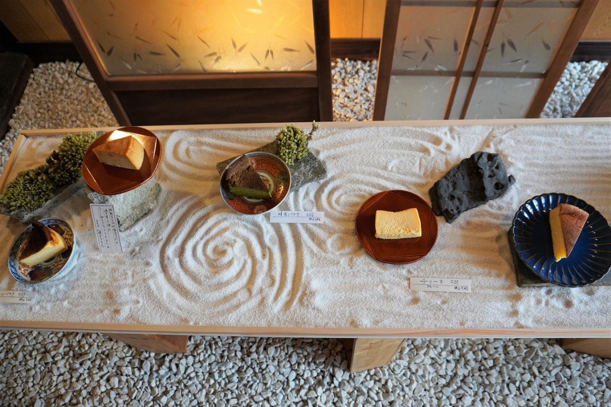 「靴のままどうぞ」という案内に誘われ砂利の上に歩を進めると、なんだか枯山水の世界の中に入り込んだような不思議な感覚に。ここでどんなチーズケーキと出合えるのか、期待が高まります。