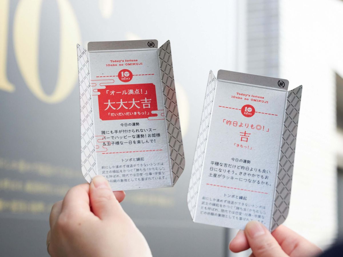 「ベイクドフレンチ」を堪能した後は、勝ち虫である“トンボ”の縁起を担いで運だめしを!受け皿として使っていた台紙がおみくじになっているので、おいしさの余韻に浸りながらお互いのおみくじを見せ合って楽しんでみて。めったにお目にかかれない、最上運の「大大大吉」に出合えたらいいことがあるかも♪