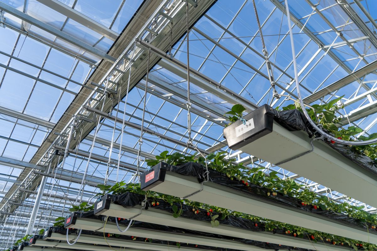 ハウスのなかに入ると、いちごの栽培棚が頭上から吊り下げられており、これが“空中いちご園”と呼ばれる由来。こうすることでいちごを育てるスペースが増え、地面で栽培するのに比べて倍近くいちごを収穫できるそう。同じ栽培方法をとる農園のなかでは「グランベリー大地」が日本で最大級の規模を誇ります。