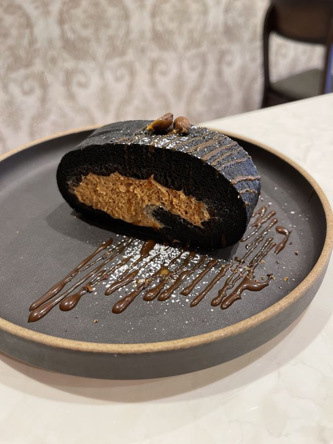 竹炭を混ぜ込んだふんわりとした生地でエスプレッソのコーヒークリームを包み、キャラメリゼしたエチオピアの浅煎り豆をトッピング。さらに、自家製キャラメルソースをかけて仕上げています。