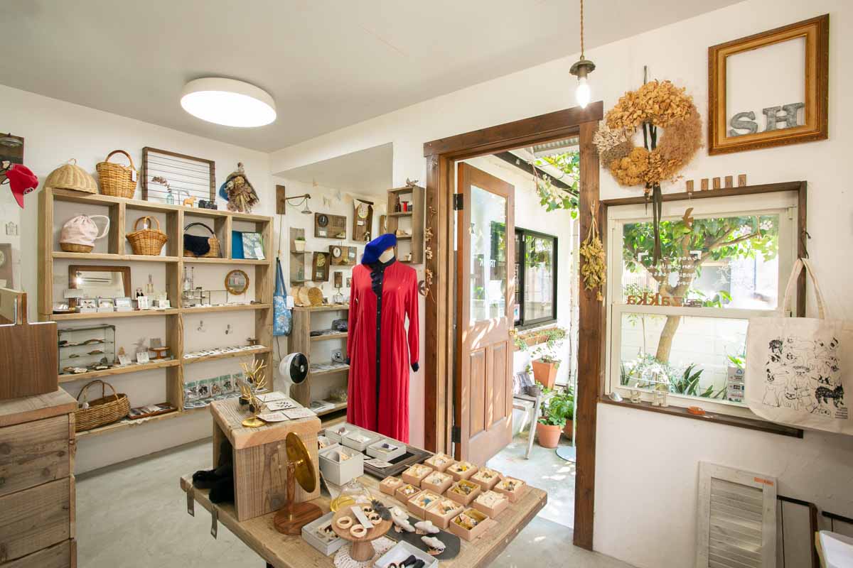 ナチュラルな雰囲気の店内には、店主がこだわってセレクトした作品がずらりと並びます。バッグやアクセサリーなどジャンル別で陳列されているので、お気に入りを探しやすいのがうれしいポイント。
