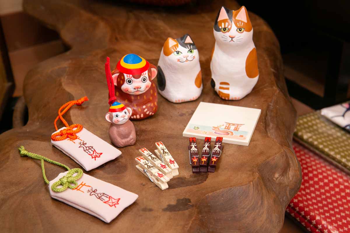左から、「おまもり袋」各900円、「宮島クリップ」3個セット500円、「土鈴あまびこ」2750円、「あまびこ張子」3000円、「猫張子」小2500円、大2800円、「宮島ひとこと箋」350円。吉村さんが作ったクリエイティブなオリジナル雑貨が揃います。一番人気は、かわいい表情の張子たち。一体一体丁寧に作る張子は表情に違いがあって、どの子にしようか迷う人も多いそうです。
