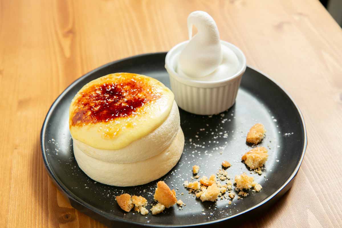「クリームブリュレパンケーキ」1250円はパンケーキにカスタードをのせて表面をパリパリにブリュレ!口の中でとろけるパンケーキとザクザクのブリュレの食感が絶妙です。こちらにもアイスクリームが付きます。