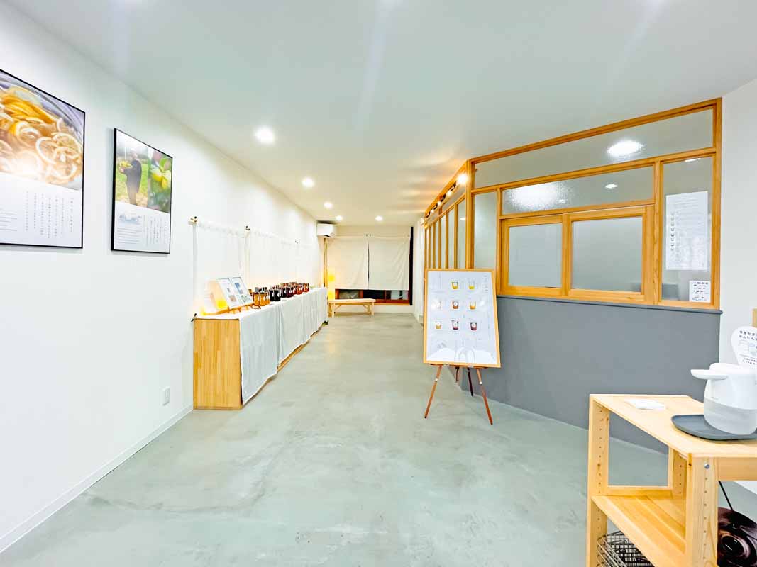「旬のうちに製造して美味しいレモネードを全国へ届けたい」との思いから、レモンの収穫時期は一旦休業して製造に専念するこだわりよう。シンプルな内装にもポリシーを感じます。