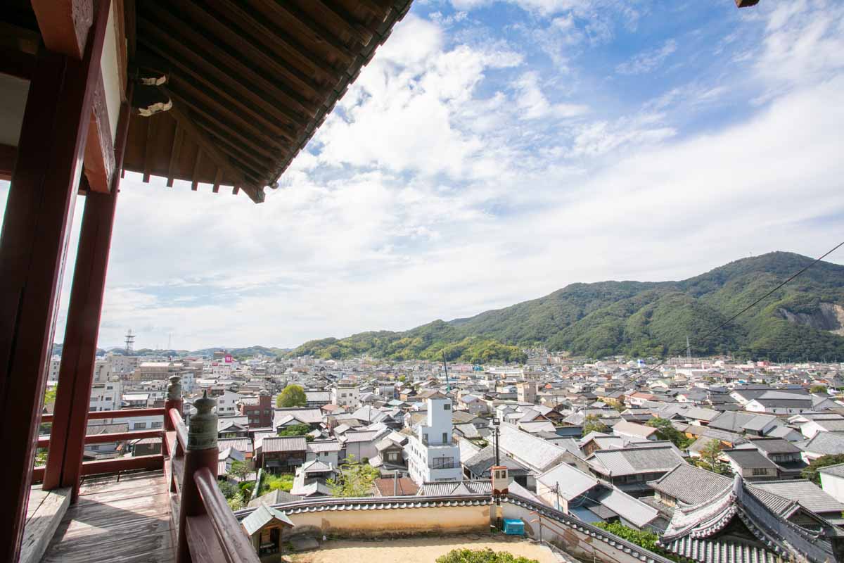 目の前に広がるのがこちらの景色!竹原の街並みを一望できます。竹原のどの位置からでも普明閣の建物が見られるのもシンボルであるゆえんです。