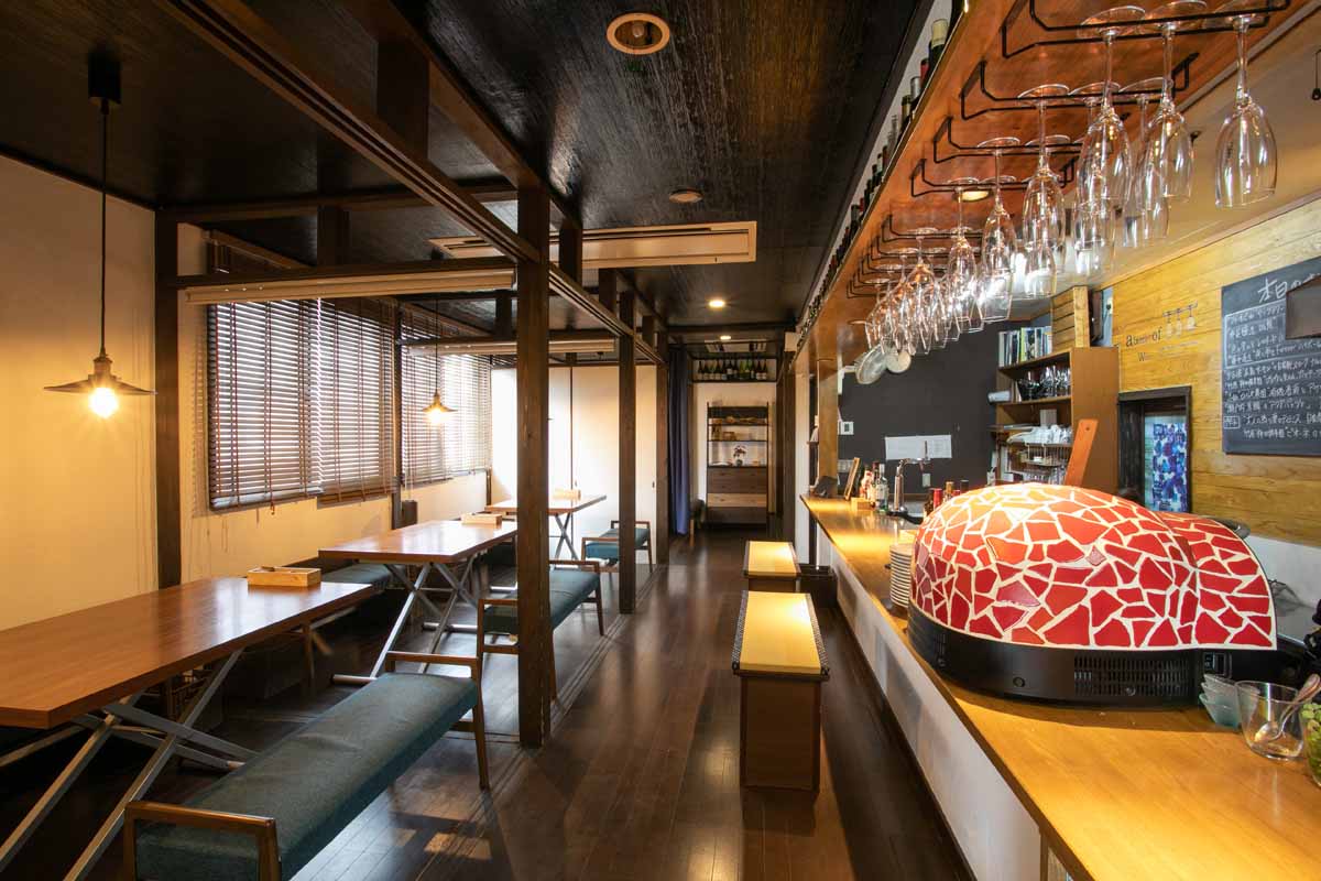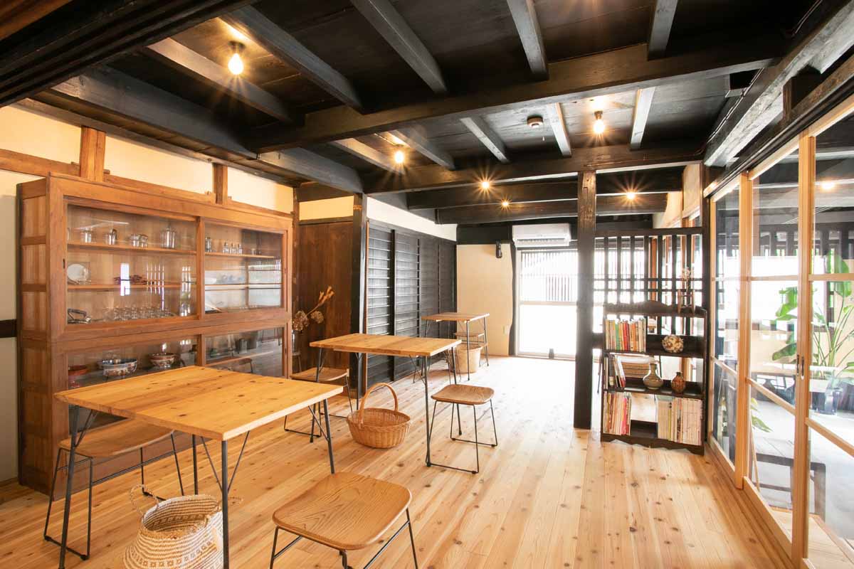明治19年(1886)に建てられた建物をリノベーション。古民家の持ち味を生かしつつ、古道具やテーブル、モダンな雰囲気のチェアがセンスよく配置されています。