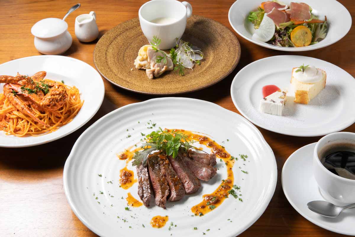 ボリューム満点の「竹原垰下牛(たけはらたおしたぎゅう)ランチコース」3300円。季節野菜のサラダ、前菜3種盛り合わせ、本日のパスタ、垰下牛サーロインのグリル、デザート、食後のコーヒーor紅茶付きです。ディナーはコースのほか、アラカルトメニューも充実。お酒と一緒に満喫したいですね!
