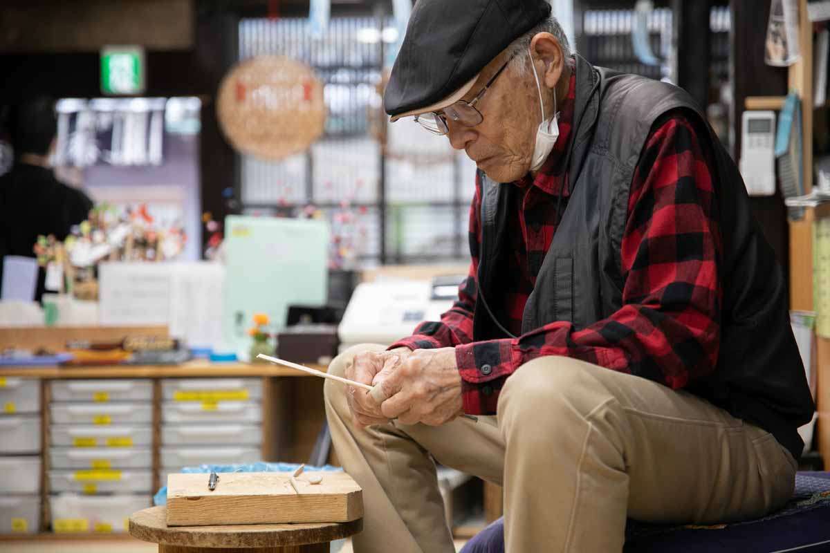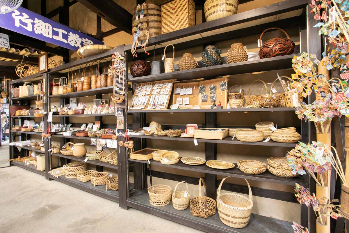 10分ほど歩いて「町並み保存地区」に戻り、地元の特産品・竹工芸を扱うお店「まちなみ竹工房」へ。ここは職人の熟練技で編み込まれた竹工芸品を展示販売するお店。水切りかご、花器など日用道具のほか、和モダンな竹バッグまで幅広く並びます。