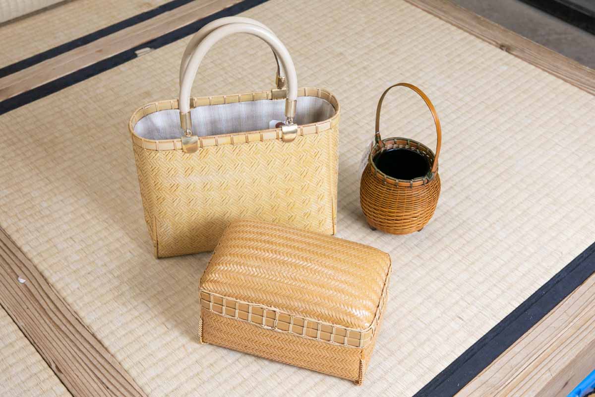 左上から時計回りに「バッグ」4万円、「花器」5000円、「小物入れ」3万円。暮らしに取り入れたいおしゃれなデザインもたくさん!丁寧に編まれた竹工芸品は長く使えて環境にもよい上、水に強いのも特徴です。手編みならではの繊細で美しい編み目に見惚れてしまいます。