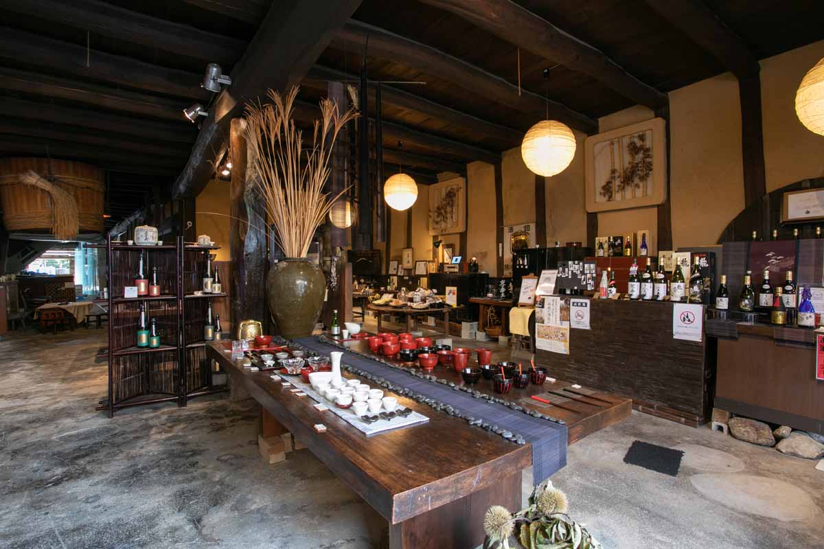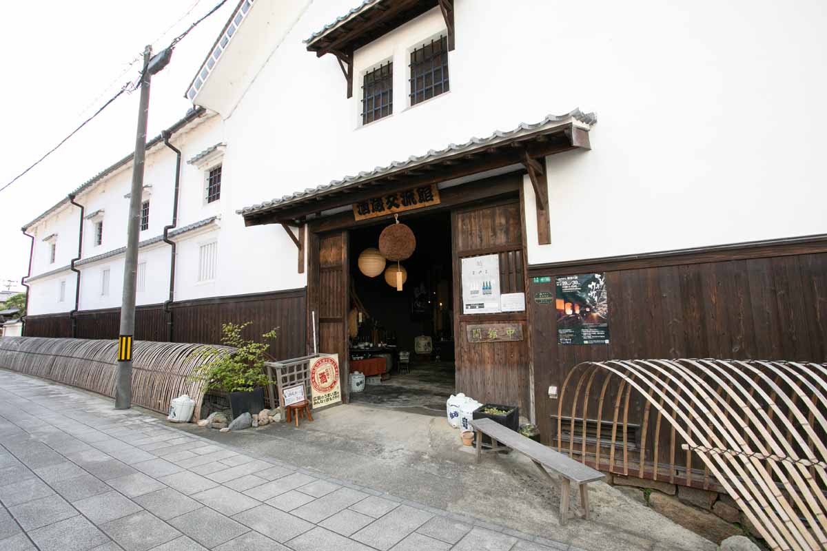「まちなみ竹工房」がある本町通りから路地を抜けるとすぐに、大きな蔵が現れます。こちらは江戸時代末期の仕込み蔵を改装して作った「藤井酒造 酒蔵交流館」。藤井酒造の日本酒をはじめ、「酒」をテーマにセレクトした酒器や器、雑貨を販売しています。おみやげとしてはもちろん、旅の思い出として自分用に購入するのもおすすめです。