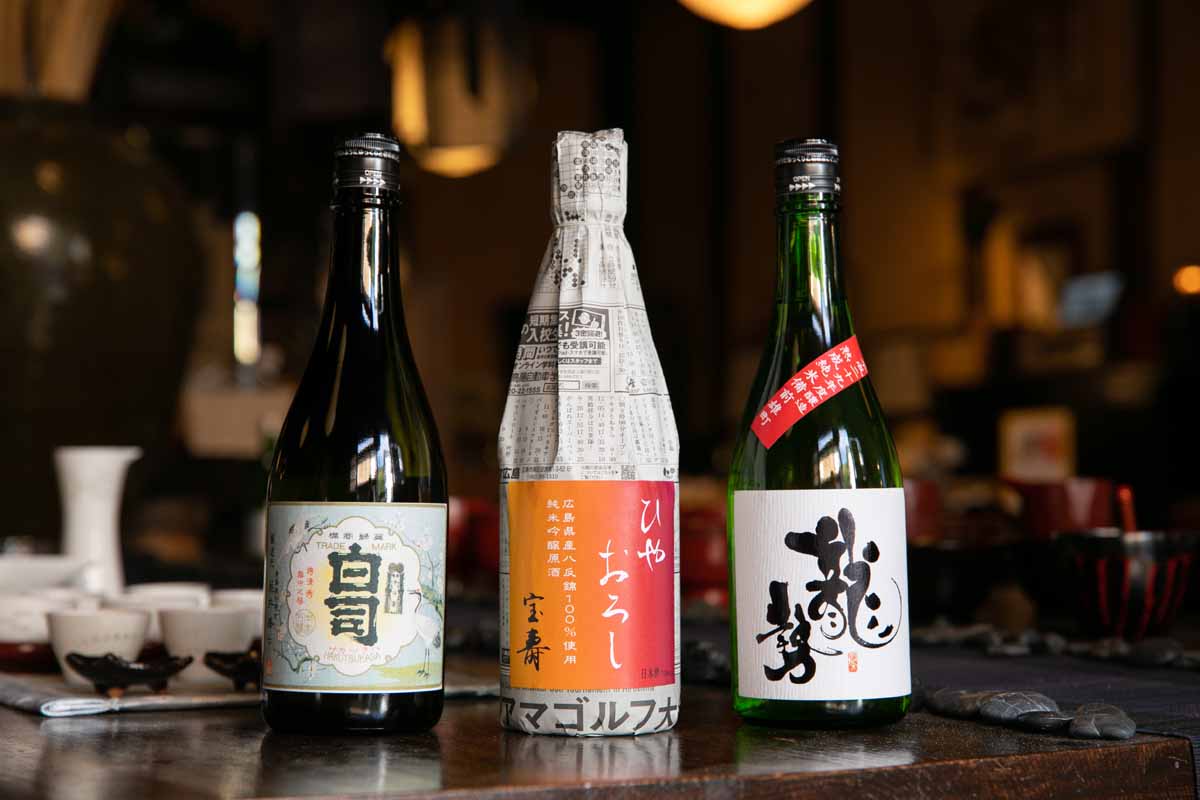 左から「白司」2035円、「宝壽ひやおろし」1980円(秋冬限定販売)、「龍勢 熟成純米雄町」1650円。日本酒は定番ものから季節もの、こちらでしか購入できない限定ラベルまで約10種類を販売。そのうち3〜4種類は試飲コーナーで飲み比べもできます。