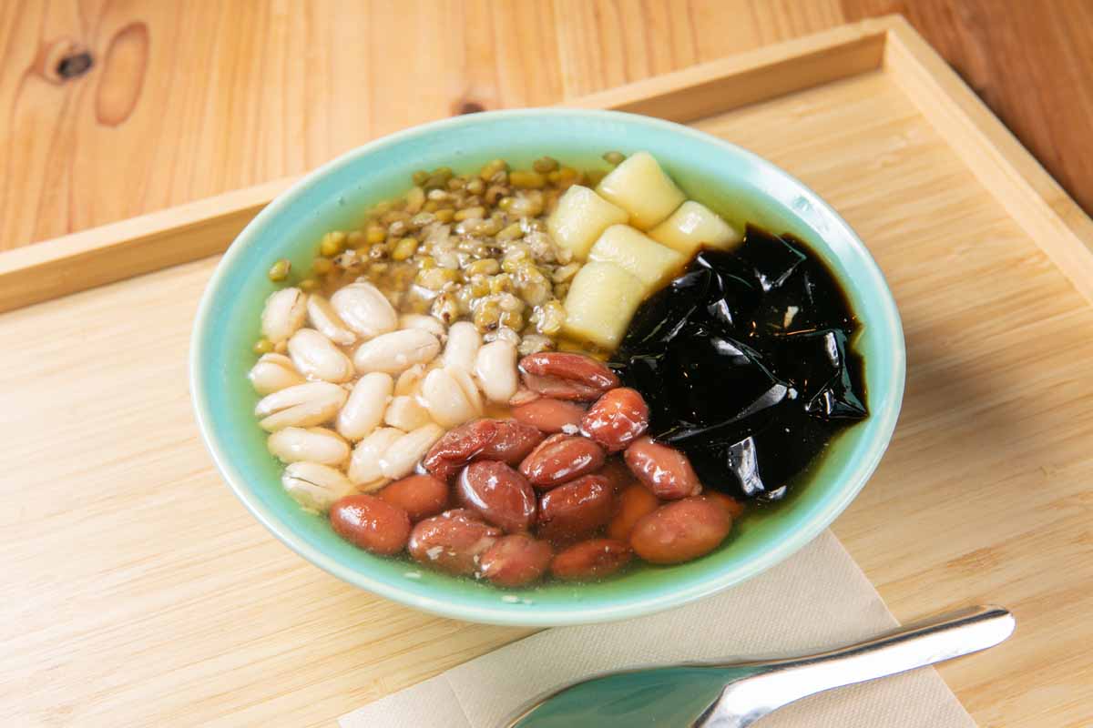 総合豆花(1000円)は豆乳で作る絹豆腐のようななめらか食感のスイーツ・豆花が主役の台湾定番スイーツ。仙草ゼリー、緑豆、ピーナッツなどカラダに優しい食材がトッピングされています。