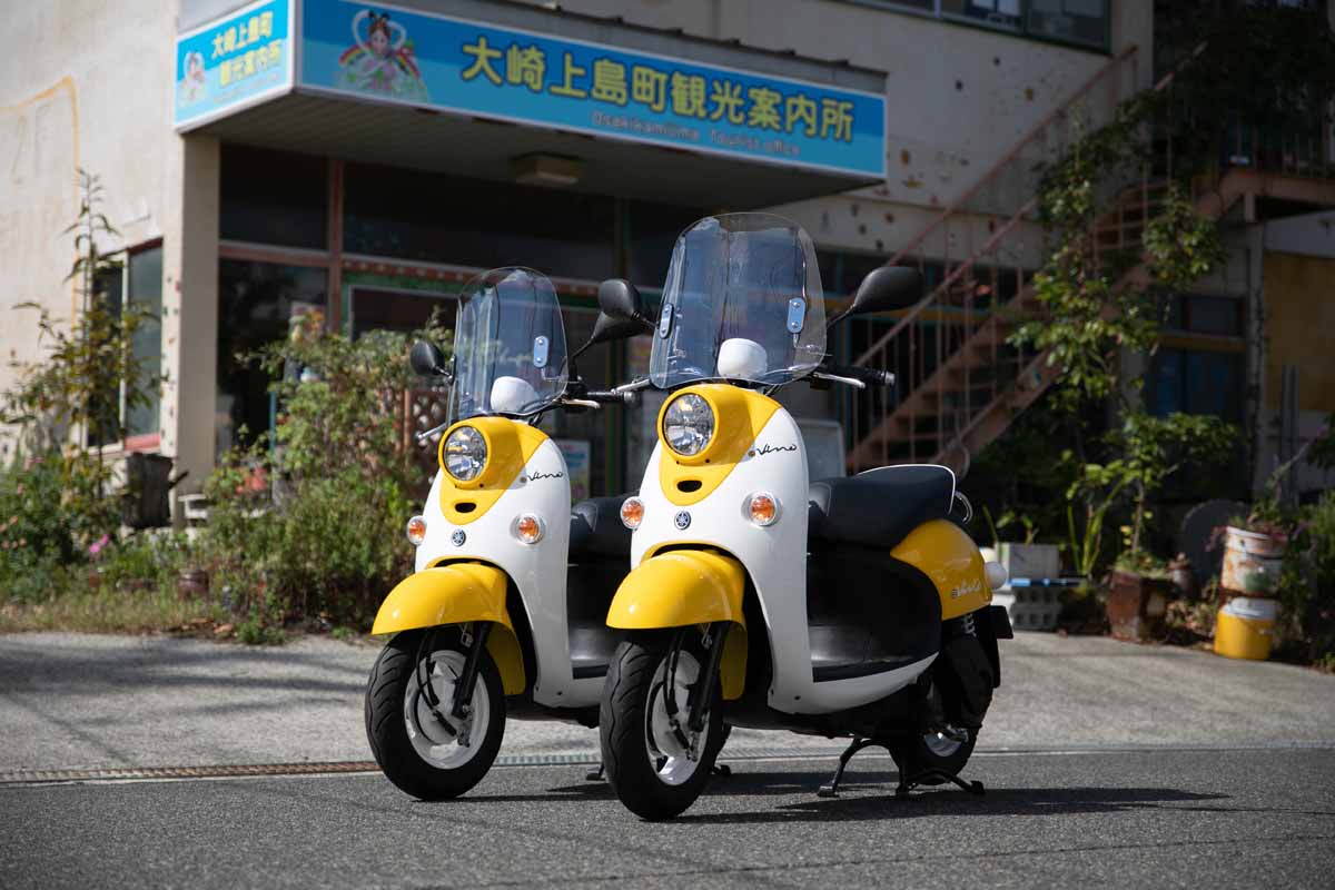 こちらで大崎上島のレモンをイメージした黄色い電動スクーターをレンタル。前日までの予約で9〜17時まで利用可能。レンタル料金は1時間1100円、2時間2200円、4時間3300円、以降1時間ごとに550円換算。要運転免許。