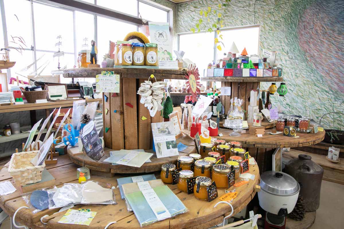 ジャム、てぬぐいなど島で作られた特産品がたくさん!おみやげ選びが楽しい店内です。