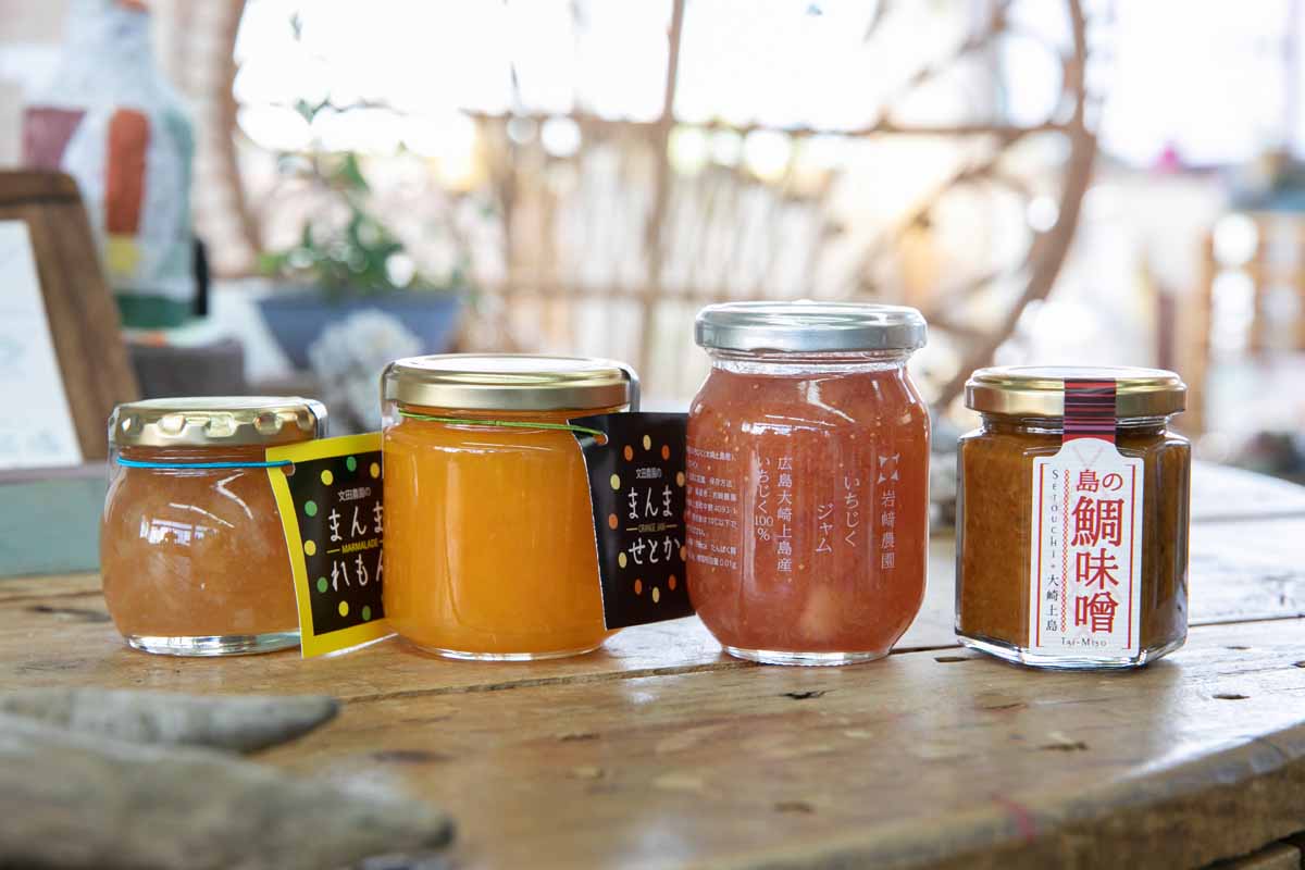 左から「まんまれもん」400円、「まんませとか」800円、「季節のジャム」800円(写真はイチジク)、「鯛味噌」648円。大崎上島の農家さんが育てた柑橘類で作るジャム各種が人気。島の老舗旅館「加藤旅館」の鯛味噌はごはんに合う逸品です。