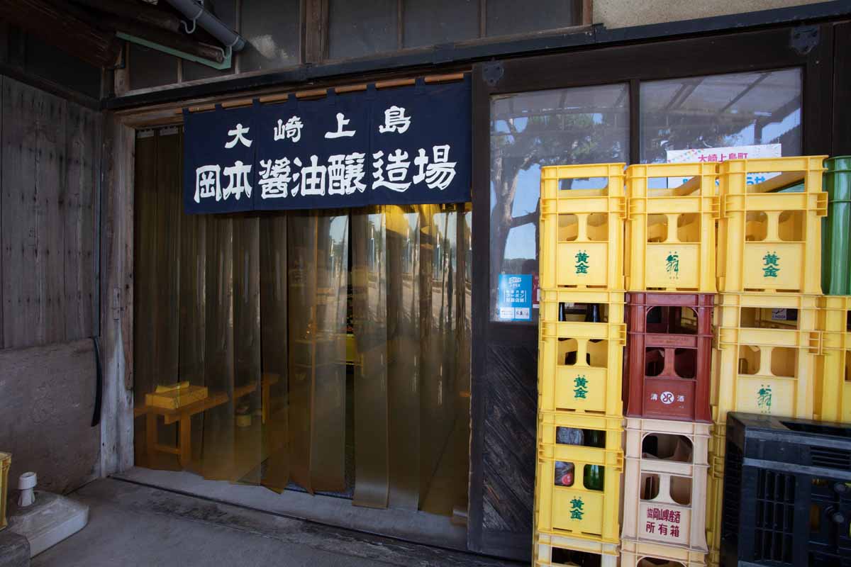 電動スクーターで3分ほど移動し、創業昭和9年(1934)の老舗の醤油蔵「岡本醤油醸造場」へ。大崎上島の地形を生かして昔ながらの製法を続けています。併設する直売所では醤油や味噌の購入が可能。事前予約すれば蔵の見学(無料、所要30分〜)ができるのでぜひ旅のプランに盛り込みましょう。