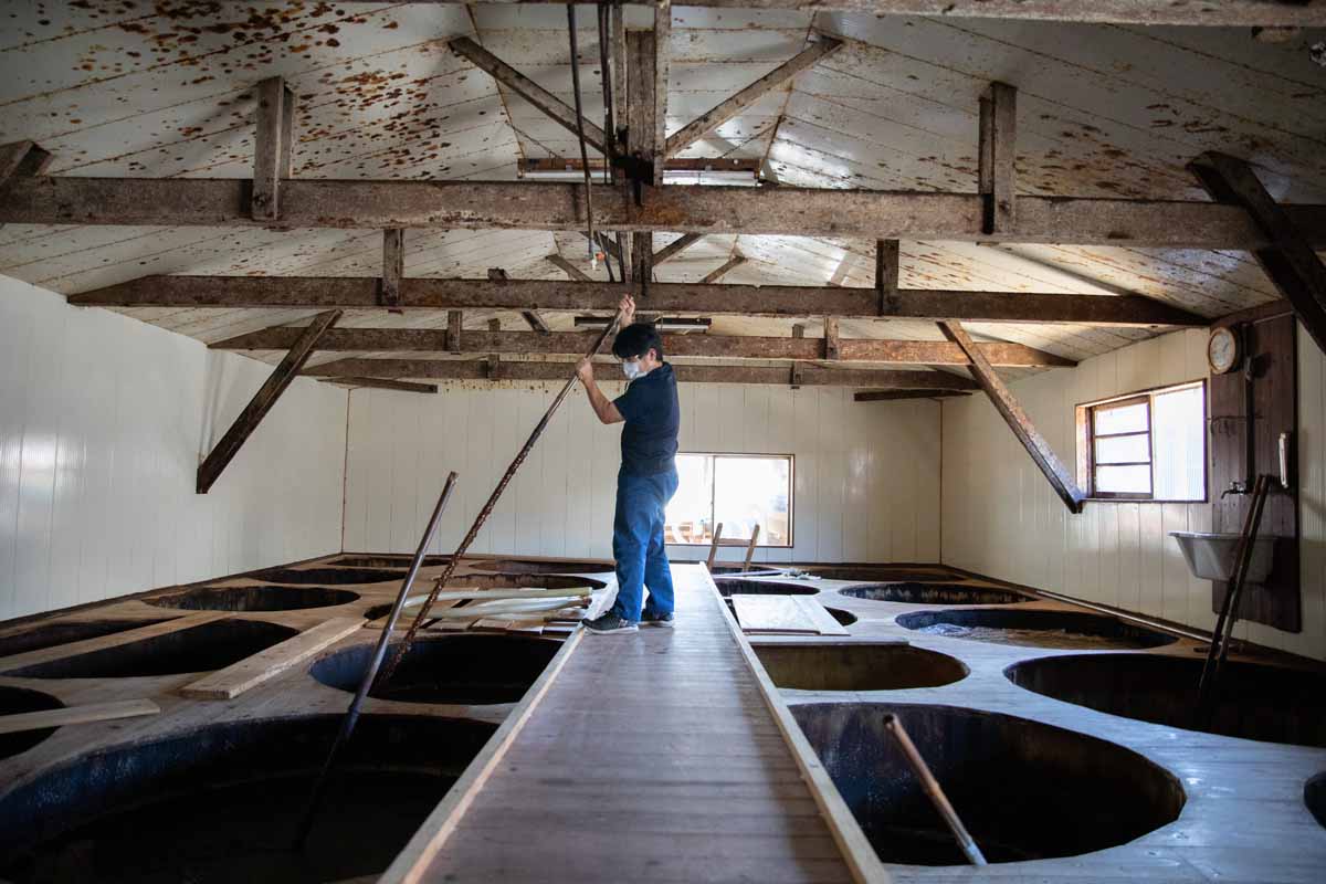 杉の木桶で醤油作りを続けるのは全国的にも珍しいとのこと。山側から海へ抜ける風が心地よい場所に蔵はあります。この風も手伝って岡本醤油ならではの味わい深い醤油に仕上がります。