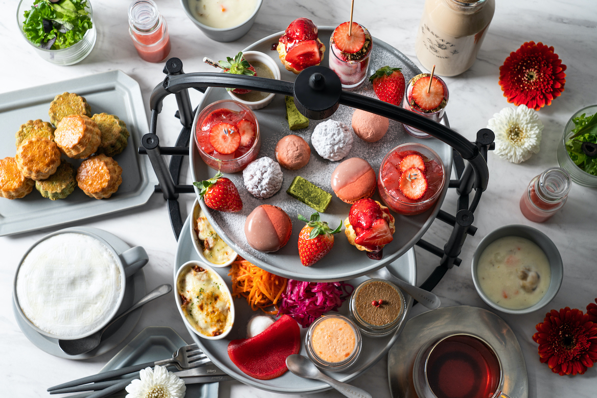 スイーツメニューは、フレッシュないちごの味わいをディップで楽しむ「ほうじ茶練乳」や、ほのかにラベンダーが漂うウバゼリー入りの「いちごわらび餅」、木いちごのソースが鮮やかなマーブルのシャンティにほうじ茶きなこをのせた「団子のヴェリーヌ」、ルビーチョコレートをかけた「ストロベリーウバクリームのマカロン」など、鮮やかないちごが彩る和洋多彩なラインアップ。
