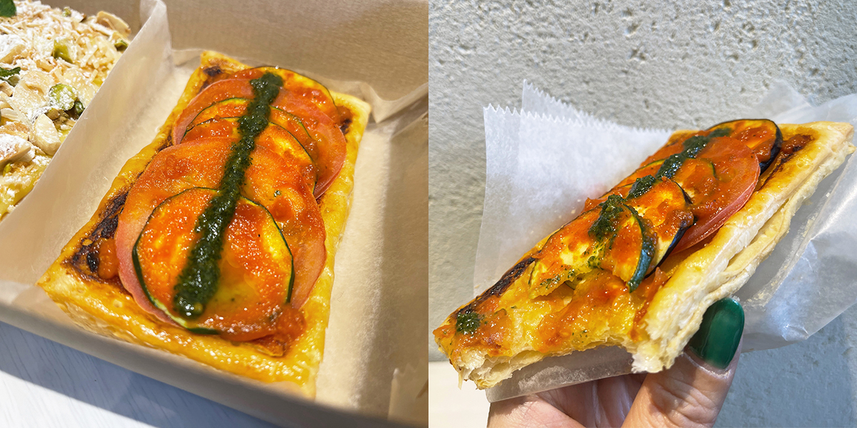 パフピッツァ生地が自家製のマリナラソース(トマトソース)やバジルソースともマッチ! 薄くスライスされたズッキーニとトマトとの相性も絶妙で、あっという間に完食してしまいそう。