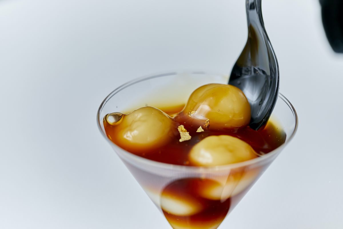 ブランデー仕込みの梅酒蜜で、白玉が大人のデザートに。芳醇な香りの蜜にプラスして梅酒に漬け込んだ3粒のレーズンが味に奥行きを生みます。いままでの白玉のイメージを覆す、新しい味に出合えます。