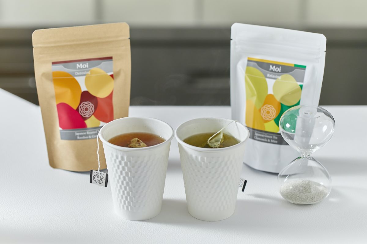パックの中にはカモミールの花や茎、ミントの葉の姿がたっぷり。2分ほど蒸らして、しっかり抽出します。宇治茶をベースにハーブの爽やかですっきりとした香りが口内に広がります。リラックスする時間に飲みたい味。
