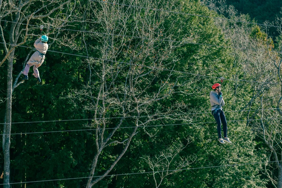 吊り橋を渡る途中、視線の先には「ジップライン」を楽しむ人々が。三島スカイウォークでは、自然溢れる環境をたっぷり堪能できるアクティビティも充実しています。