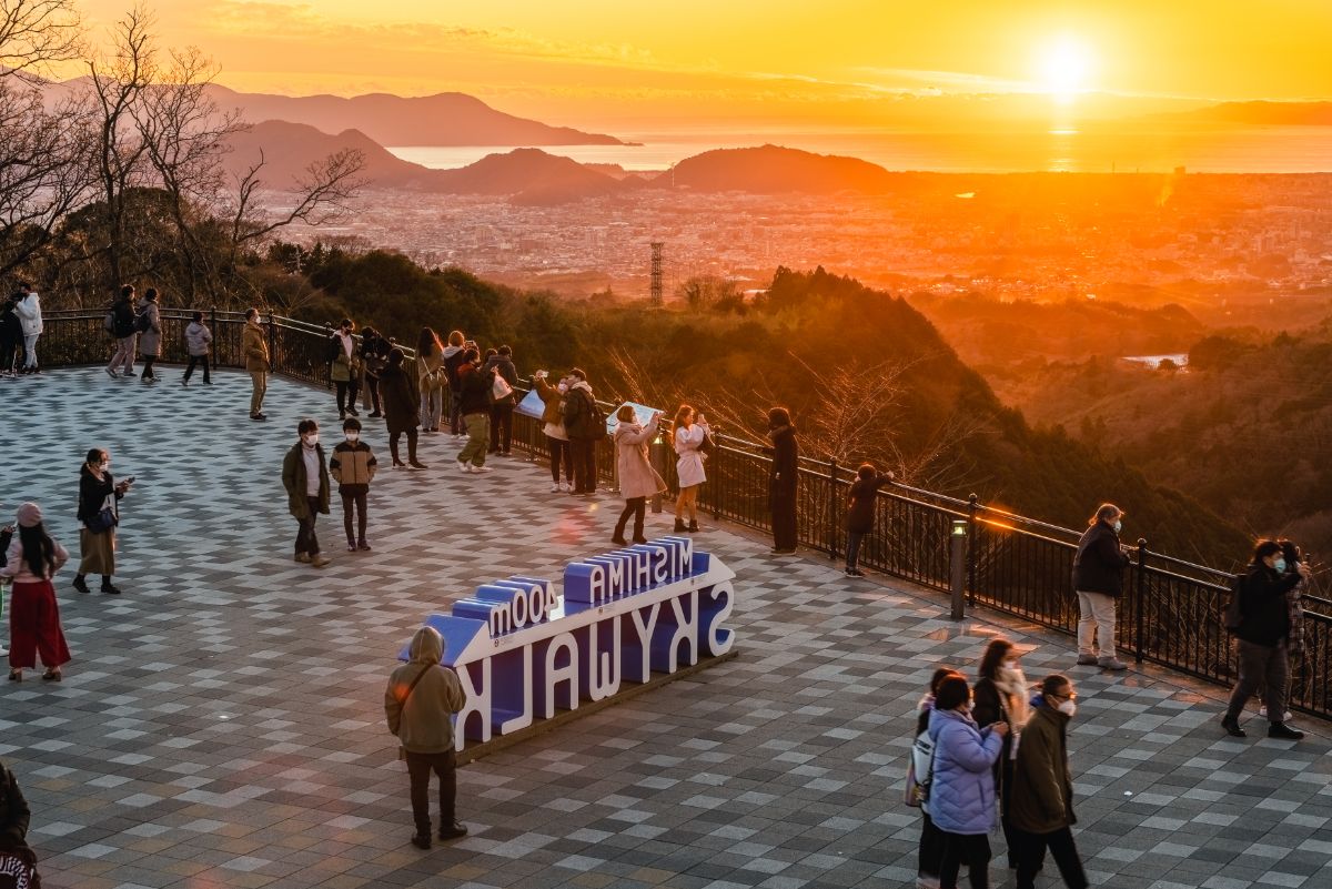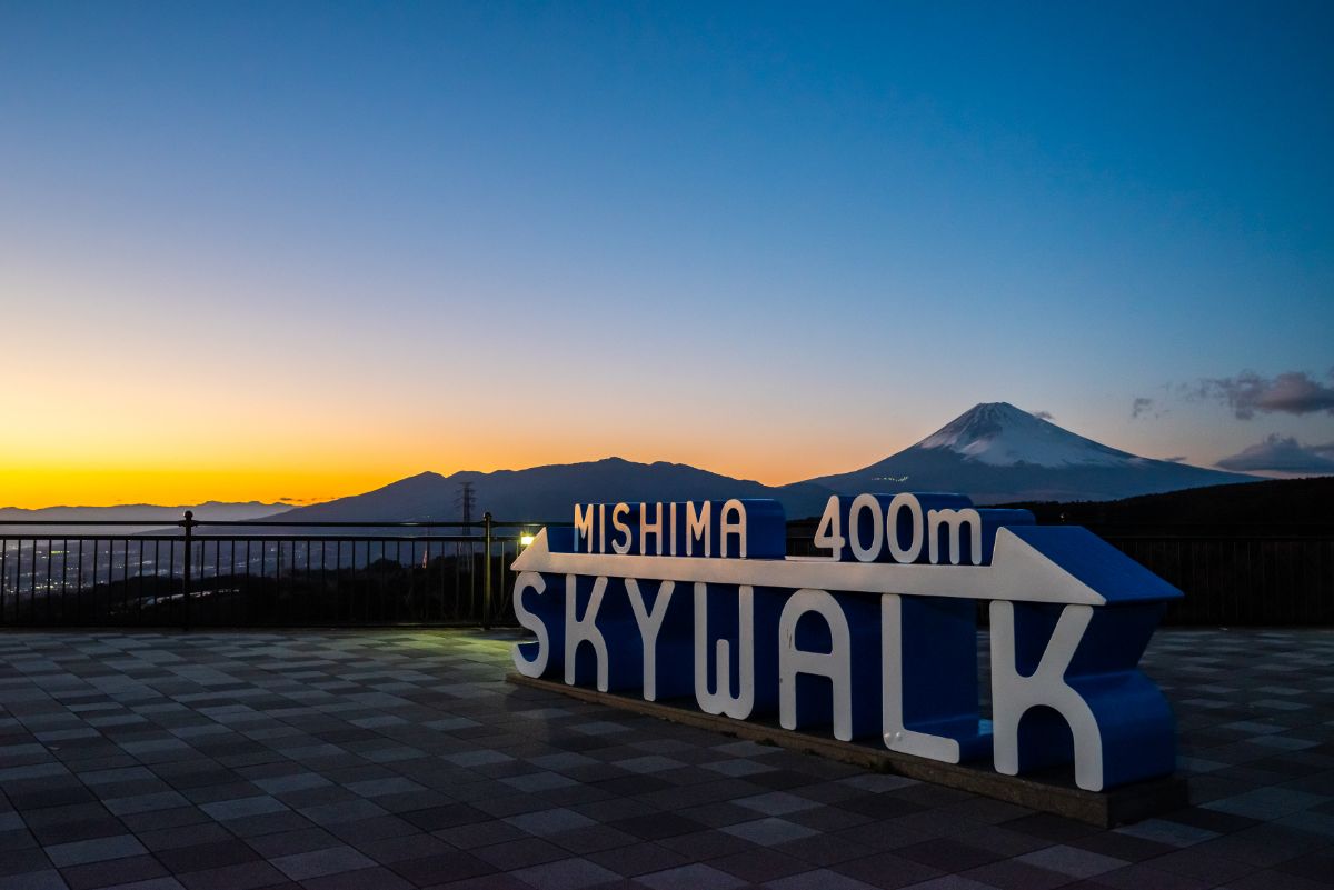 三島スカイウォークでは、2月上旬までの期間限定で「サンセットスカイウォーク」が実施されています。16時以降、夕日を見るために追加料金なしで再入場が可能。富士山や駿河湾を力強く染め上げる夕日は、一見の価値ありです!