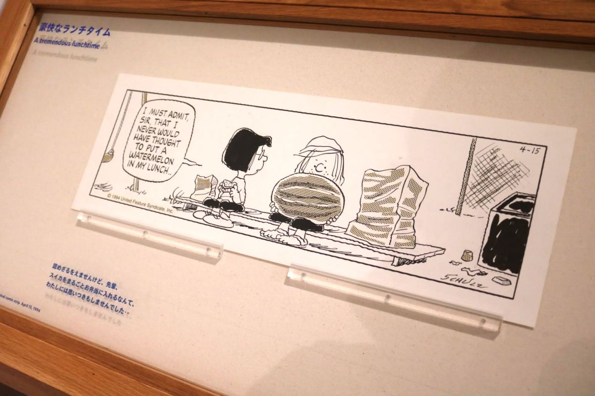 コミックはもちろん、作品につけられた、思わずクスッとしてしまう、キャッチーなタイトルのほか、アメリカン・フードのパッケージに使われていそうな柄の装飾、紙ナプキンをモチーフにした解説パネルなど、展示の工夫もみどころです。お気に入りのシーンを見つけてみてくださいね。