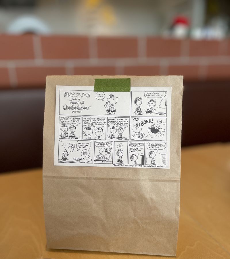 こちらのメニューはテイクアウト専用メニューで、ランチタイムを楽しむサリーとライナスのアートカード付き。紙袋に入れて提供されるので、アメリカンな気分でランチタイムも味わえちゃうメニューです。