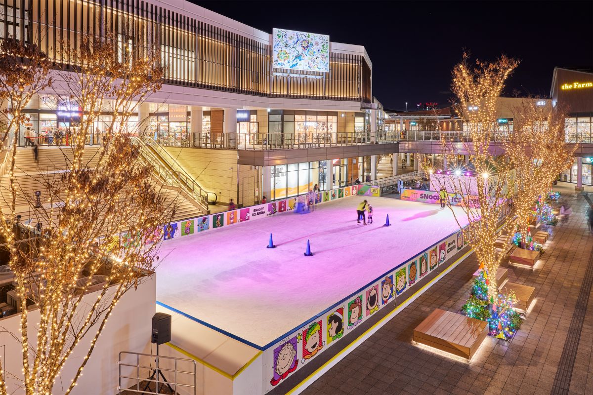 日没後には7 色の光が色鮮やかにスケートリンクをライトアップする演出も。スヌーピーたちと一緒にスケートを楽しんでみませんか。