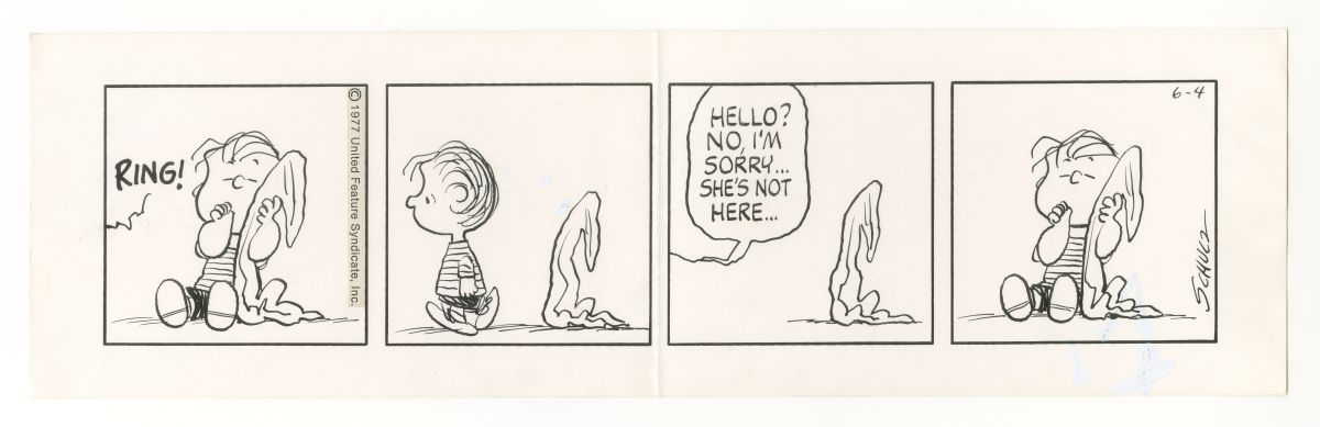 いつでも安心毛布と一緒のライナス。仕方なく毛布から離れて電話を取りに行きますが、毛布は形を変えずにライナスのことを待ってくれています。