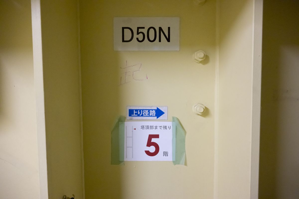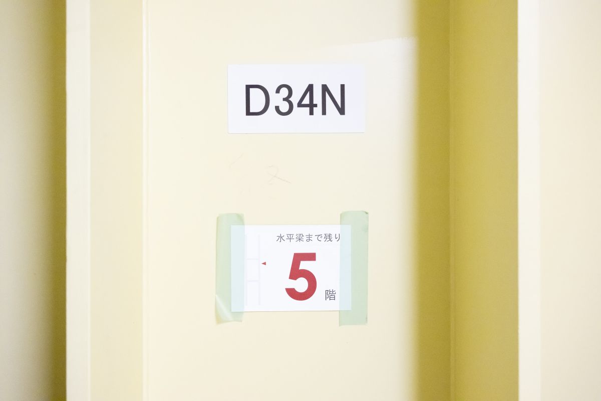 ひたすら階段を上り続け、「水平梁」まで、あと少し……! ところどころに貼られている残りの階数を示す紙が、大きな励みに!