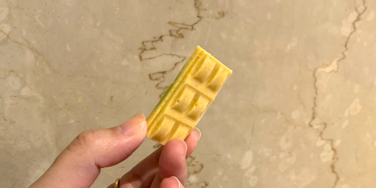 今回レコメンドしていただいた「イロドリチョコレート」の1つ目は、ピスタチオとマンゴーのフレーバーが楽しい「もえぎ」。ピスタチオの風味とマンゴーの甘さが、お互いを引き立て合い絶品です。