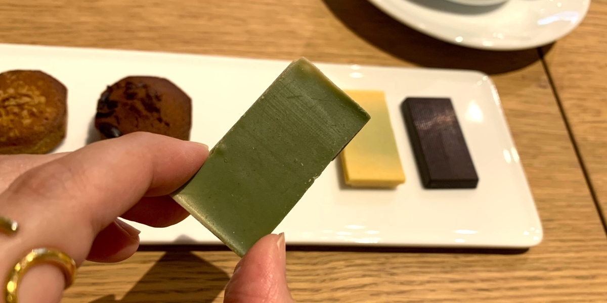 もう1つのチョコレートは「しゅうせい」。こちらは、抹茶とほうじ茶のフレーバーです。お茶特有の風味と甘味がマッチし、華やかな印象。日本茶ではありますが、不思議とコーヒーにマッチします。