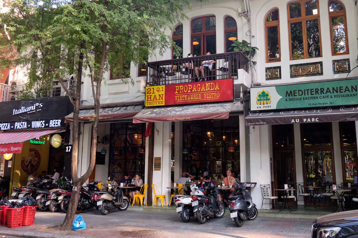 ホーチミンの中心部、聖母マリア教会から徒歩すぐの場所にある「Propaganda(プロパガンダ)」は、緑豊かな公園に面したカフェ&レストランです。古き良きフランス領時代を思わせる長屋風旧家の一角を改装した店で、軒先にはテラス席もあり街歩きの休憩にもぴったり。