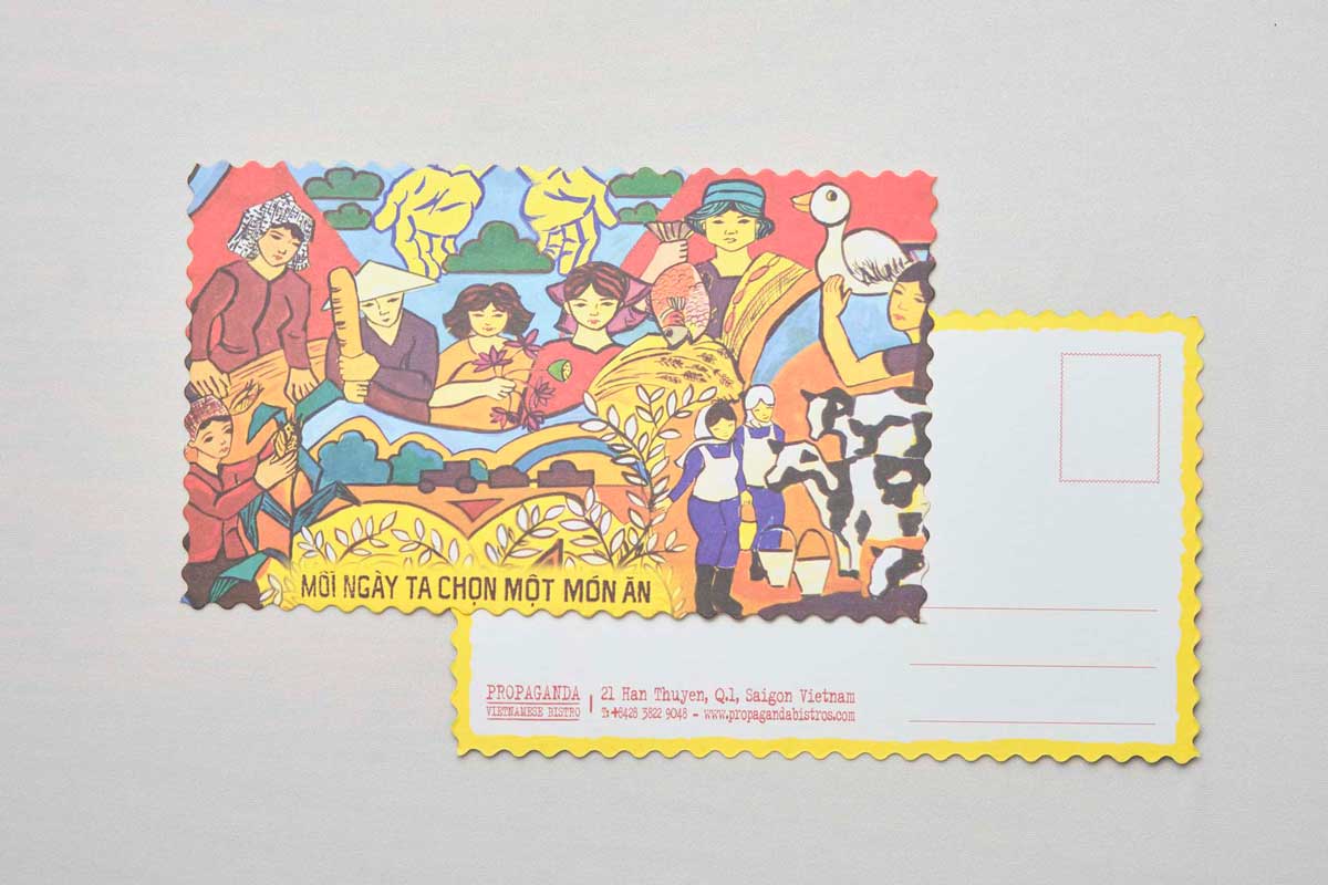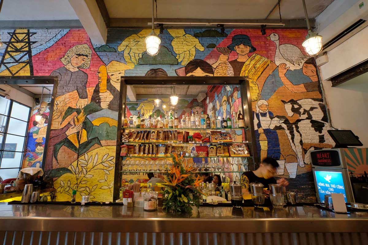 店に入ってまず驚くのが、壁一面を飾る圧巻のオリジナル・プロパガンダアート。時に誇らしげに、時にコミカルに、ベトナムの様々な労働者の姿を鮮やかな色彩で描いたもので、独得の画風が唯一無二の存在感を放っています。