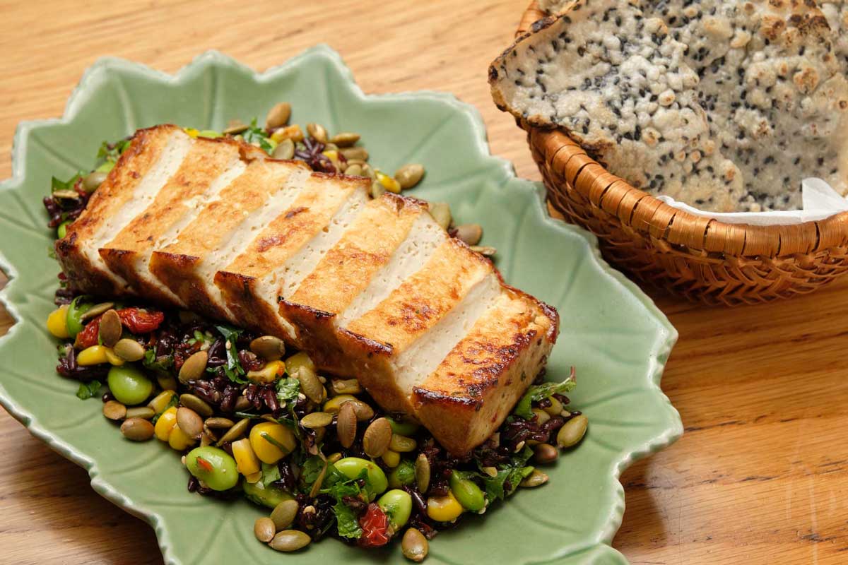 ベジタリアンでも安心の「Propaganda Salad(枝豆入り豆腐サラダ)」15万VNDは、素材の味を生かしたシンプルな優しい味付け。添えられたごませんべいに載せて食べると食感のハーモニーも◎。