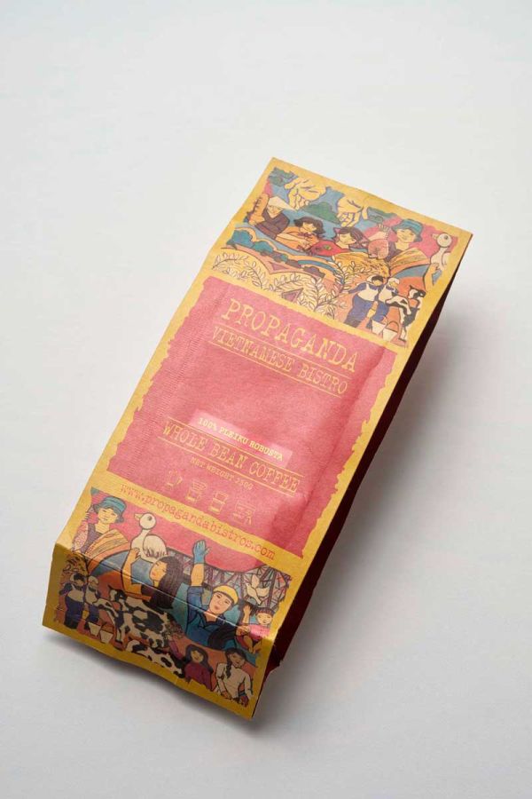 店内ではカラフルなプロパガンダアートをプリントした各種オリジナルグッズも販売しています。ホームウェアからキッチンウェア、ベトナムの特産である「コーヒー豆」15万VND(写真)など、様々な種類が揃っているので、ほかとは少し違うベトナムらしいお土産として、ぜひ購入してみては?