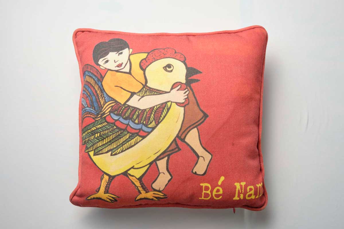ベトナムの伝統工芸ドンホー版画をイメージさせる「クッションカバー」38万VND。