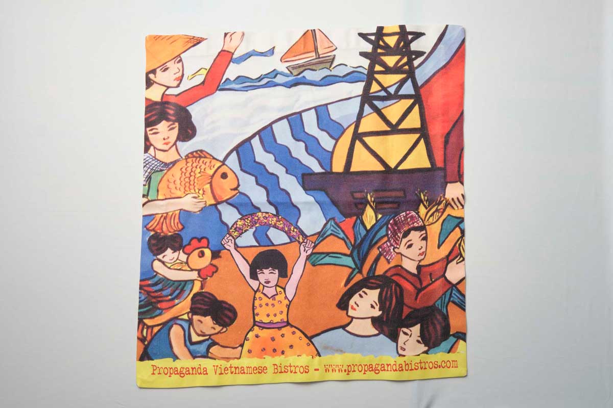写真の「ナプキン」30万VNDやランチョンマットなどもプロパガンダアート一色。